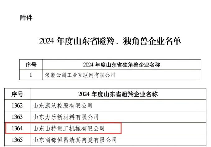 近日,山東省工業和信息化廳發布《關于公布2024年度山東省瞪羚、獨角獸企業的通知》,山特重工憑借著卓越的創新能力、高速的成長態勢,成功獲評2024年度“山東省瞪羚企業”。